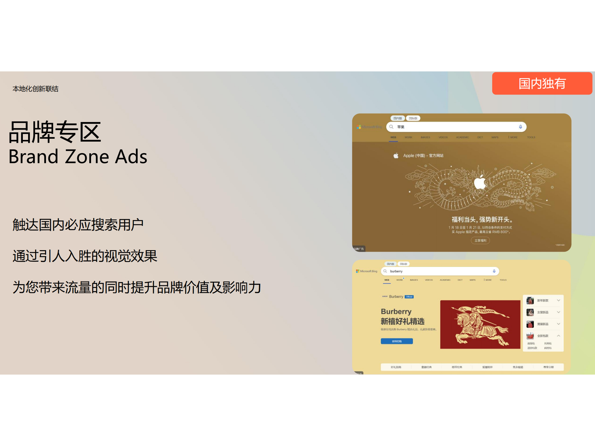 品牌展示曝光产品,以必应海量的通用词搜索资源为媒介,以创新的样式和视觉交互吸引品牌认知阶段的搜索用户,加深用户对客户品牌的第一印象,进而引导用户形成对品牌的好感和忠诚度。¥ 0.00立即购买